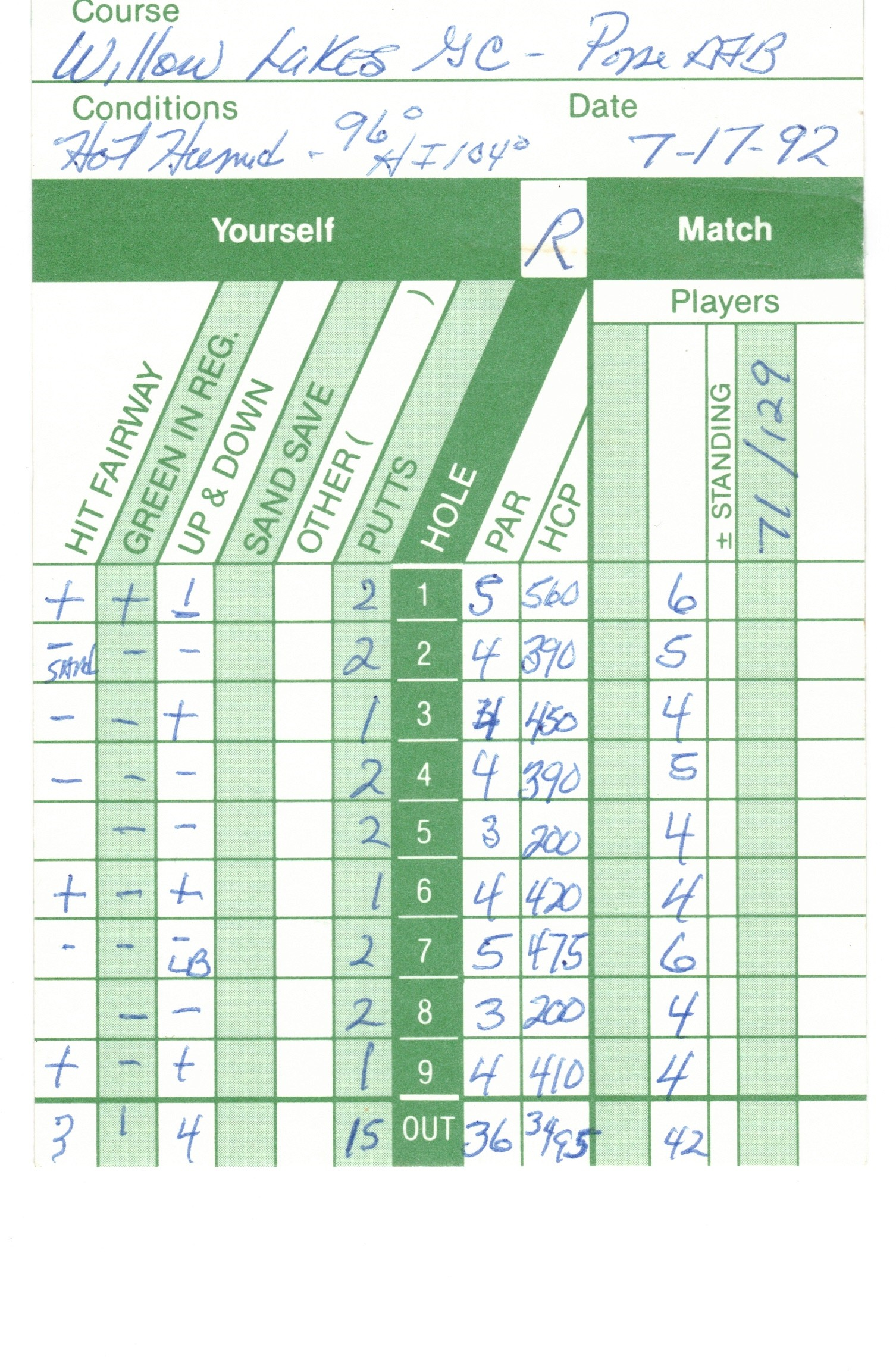 Therefore, by 2010, Willow Lakes Golf Course became history. But, I guess, as a gift from the Golf Gods, I have a record of my last round played at the course, as well as pictures from that outing. Forever frozen in time, July 17th, 1992; a hot & humid day, 96 degrees with a heat index of 104; par 72, playing to 7065 yards. And, now, just a memory.